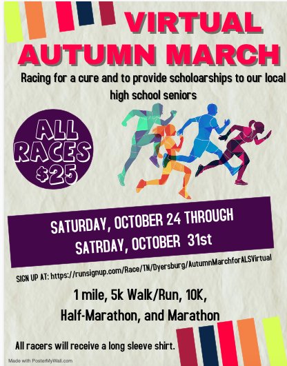 After being forced into retirement because of my weakened physical abilities, I noticed there were advocates that did a yearly walk for ALS. I thought this was so cool and the way I could try to find a way to be useful. Every year in our little West Tennessee town we have always had race on the 3rd Saturday of October. It was coming up on the 26th annual Mission March. I called my friend who had always run in it as I had in the past and asked how could I do a walk in conjunction with the Mission March to help support ALS research and help our little community in some way. To give back to the community that had always loved me through this horrible disease that was my goal. When I called Bart, I asked him if we could do a simple walk along with the Mission March event. He sadly told me that the event had been canceled. He then told me that he had run the race every single year and was very sad it was going to be let go. I said, “I’ll be on the committee if you want to try to do something with it.” He replied, ” Be on the committee? You are the committee!” And so out of that conversation, became the Autumn March for ALS.