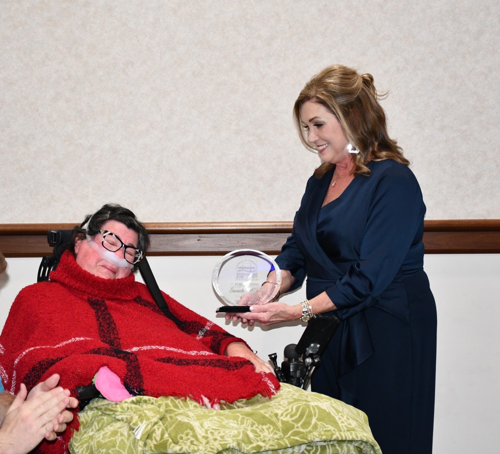 Then, we came to the award before the Woman of the Year. It was a young man who was successful in founding his own construction business and also became a Baptist preacher, too. He gave God all the glory. I felt the Holy Spirit. They started to read about the next award and I was praying, “Not me, not me, not me.” I heard them say, “This nominee was an educator for 20 years…” and the tears began to fall. I had to say something for God. I was praying for the Holy Spirit to fill me and give me the words to turn hearts back to God in a world saturated with sin and self indulgence. Our jobs are to take care of each other. We are to love God above everything and everyone. I was trying to get my ventilator unplugged and roll to the microphone. They brought it to me and told me I didn’t have to speak if I didn’t want to speak. I almost had my grandson stand up in his chair and say “ ‘There’s Superman Jason Reed’* I said, “The only muscle that still works is my jaw muscle, so I am going to speak. I love Dyer County. I grew up here. I see so many people here that I know: Wilson, Lisa, Ann, Joe, and so many I can’t name them all. There is a special thread that runs through us and that is our faith in God. We take care of each other. Do you remember the parable about the widow that swept the floor for the coin and would not quit until she found every coin? My question is what coin are you? A gold coin? A shekel? It doesn’t matter. Each one of you is just as important as the other. We are all children of God. We are all in different boats and we just need to get them going in the same direction like C. S. Lewis said. I want to share with you what I have been doing this Lent the 40 days before Easter and pray with me this simple prayer: ‘Empty me. Fill me. Use me.’ Empty me Dear God of all my sins and the negative thoughts and actions that are separating me from You God. Fill me God with the Holy Spirit. Help me be more like You. Turn us and our community back to You, God. Then God, use me. Use me to reach the Least of us. Use me for your purpose. Use me until I am gone. In the name of the Father, Son, and the Holy Spirit, Amen. Thanks to all of you who support me with the Autumn March Race, Matthew 25:40, Inc., and my crazy, spontaneous ventures to help others. God bless you and take the microphone because I could talk all night.” And that was it, I let the Holy Spirit give me the words. So many people told me how much they loved and appreciated my speech. In the parking lot, Superman had a prayer circle praising God for using us to bring the Word to our community. I totally forgot to tell them I want to be known not as the Woman of the Year but just a Woman of God.